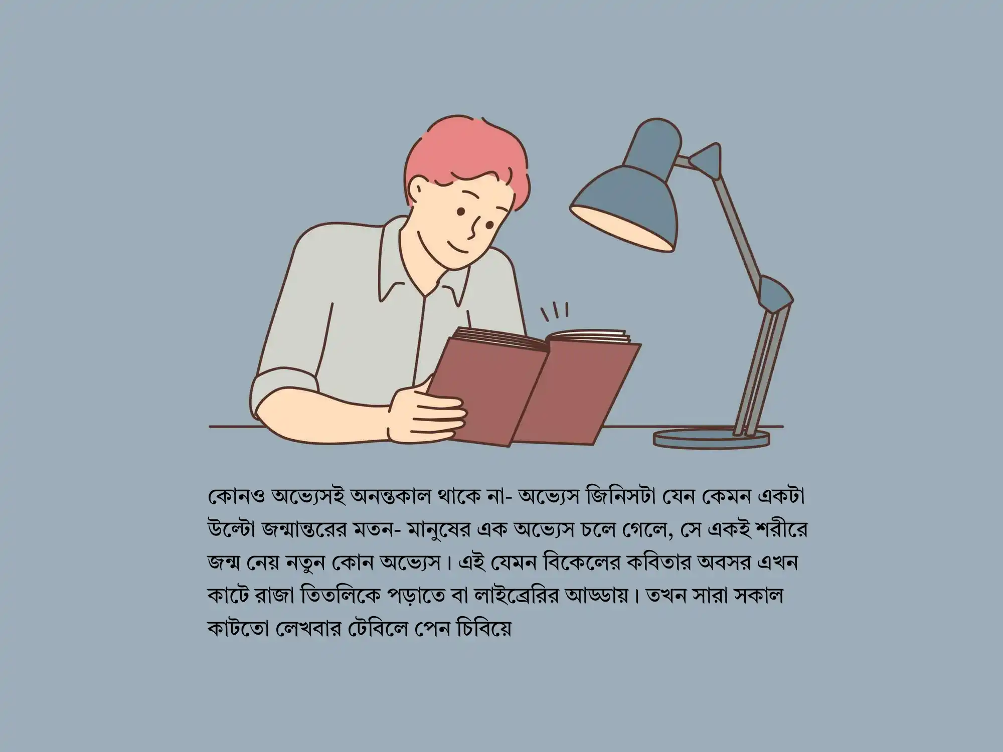 কোনও অভ্যেসই অনন্তকাল থাকে না- অভ্যেস জিনিসটা যেন কেমন একটা উল্টো জন্মান্তরের মতন- মানুষের এক অভ্যেস চলে গেলে, সে একই শরীরে জন্ম নেয় নতুন কোন অভ্যেস। এই যেমন বিকেলের কবিতার অবসর এখন কাটে রাজা তিতলিকে পড়াতে বা লাইব্রেরির আড্ডায়। তখন সারা সকাল কাটতো লেখবার টেবিলে পেন চিবিয়ে-এখন সে সময়টা, মায় বিকেলগুলোও যায় আলো-আঁধারের অফিস ঘরে।
