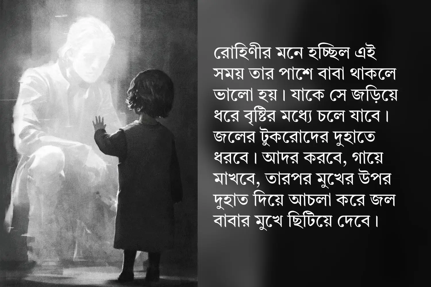 বৃষ্টি পড়ছিল কালো মেঘে আকাশটা ভরেছিল ভোর থেকে প্রথমে ঝিরিঝিরি, তারপর প্রবল বৃষ্টির ফোঁটা এসে আছড়ে পড়ছিল কংক্রিটের উঠোনে সেদিকেই তাকিয়েছিল রোহিণী নাচছিল বৃষ্টির ফোঁটাগুলো, নাচতে নাচতে তাদের শরীর ভেঙে অনুপরমানুতে ধাক্কা খেতে লাগল, ভাঙাগড়ার খেলায় মিহি বাতাস খেলা করছিল দামাল বালকের মতো রোহিণীর মনে হচ্ছিল এই সময় তার পাশে বাবা থাকলে ভালো হয় যাকে সে জড়িয়ে ধরে বৃষ্টির মধ্যে চলে যাবে জলের টুকরোদের দুহাতে ধরবে আদর করবে, গায়ে মাখবে, তারপর মুখের উপর দুহাত দিয়ে আচলা করে জল বাবার মুখে ছিটিয়ে দেবে