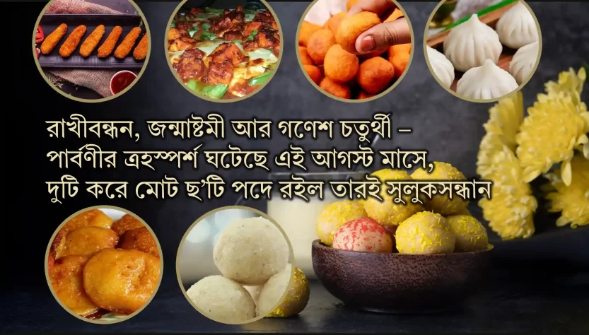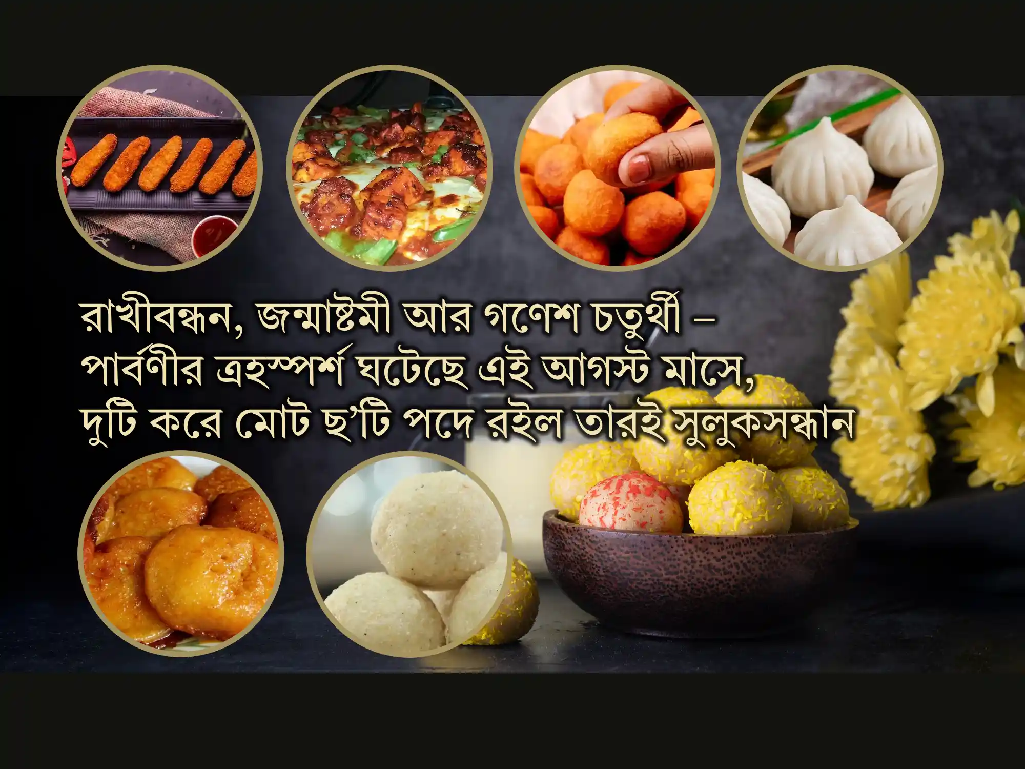 আগস্ট মাসটা বড্ড মিশ্র প্রকৃতির। শ্রাবণের বর্ষা আর ভাদ্রের গরম মিলিয়ে রীতিমতো হাসফাঁস অবস্থা। ভরসা এটুকুই–ইংরেজি ক্যালেন্ডারে এই মাসটা জানান দেয়, পুজো আসতে আর বেশি দেরি নেই। আরও একটা ব্যাপার থাকে এই মাসেই স্বাধীনতা দিবসের আগেপরেই থাকে রাখী বন্ধন। সম্প্রীতির উসব। এখন অবশ্য অবাঙালি প্রভাবে সেটা রক্ষাবন্ধন নাম পেয়েছে। তা সে নামে কী এসে য়ায়! আসলে তো উসবই। তারপর থাকে জন্মাষ্টমী। শ্রীকৃষ্ণের জন্মোৎসব। ইদানীং কসমোলিটান বাঙালি অ-বাঙালিদের পার্বণীকেও আপন করে নিয়েছে। ফলে গণেশ চতুর্থীতেও আর শুকনো মুখে থাকছে না বাঙালি। এবছর আবার রাখীবন্ধন, জন্মাষ্টমী আর গণেশ চতুর্থী – পার্বণীর ত্রহস্পর্শ ঘটেছে এই আগস্ট মাসে। প্রত্যেক পার্বণের প্রথাগত ভোগ নিবেদনের উপাচার দিয়ে কেমন করে উৎসব উদযাপন হবে? রাখীবন্ধনে আমিষ, নন্দোৎসবের তাল এবং গণপতি বাপ্পার প্রিয় মিষ্টিতে কেমন করে আরাধনা আর রসনা দুই-ই তুষ্ট হবে – দুটি করে মোট ছটি পদে রইল তারই সুলুকসন্ধান।