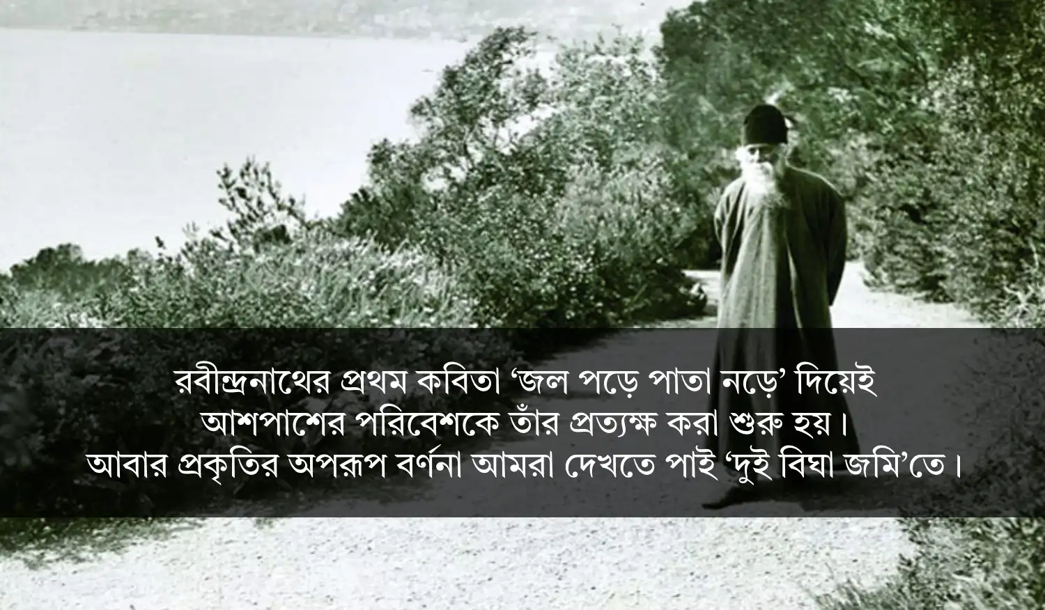 রবীন্দ্রনাথের প্রথম কবিতা ‘জল পড়ে পাতা নড়ে’ দিয়েই আশপাশের পরিবেশকে তাঁর প্রত্যক্ষ করা শুরু হয়। আবার প্রকৃতির অপরূপ বর্ণনা আমরা দেখতে পাই ‘দুই বিঘা জমি’তে।